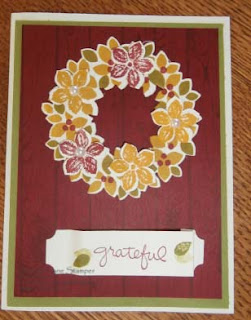 I really like this card is looks so Autumny, is that a word? Probably not. :-) The colors are so rich and fall like. I love all the seasons and welcome each one as it comes. Though winter, here in Minnesota could be a little shorter with the hazardous driving on icy roads and foot deep snow. Now that I'm retired I don't have to deal with that on a daily basis. But I digress.